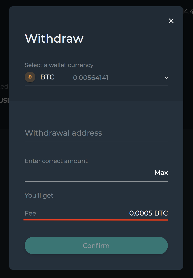 Fill in the form in the withdrawal window. Choose the amount to withdraw and type your external wallet address. Please do not forget that there is a commission charged upon every withdrawal.