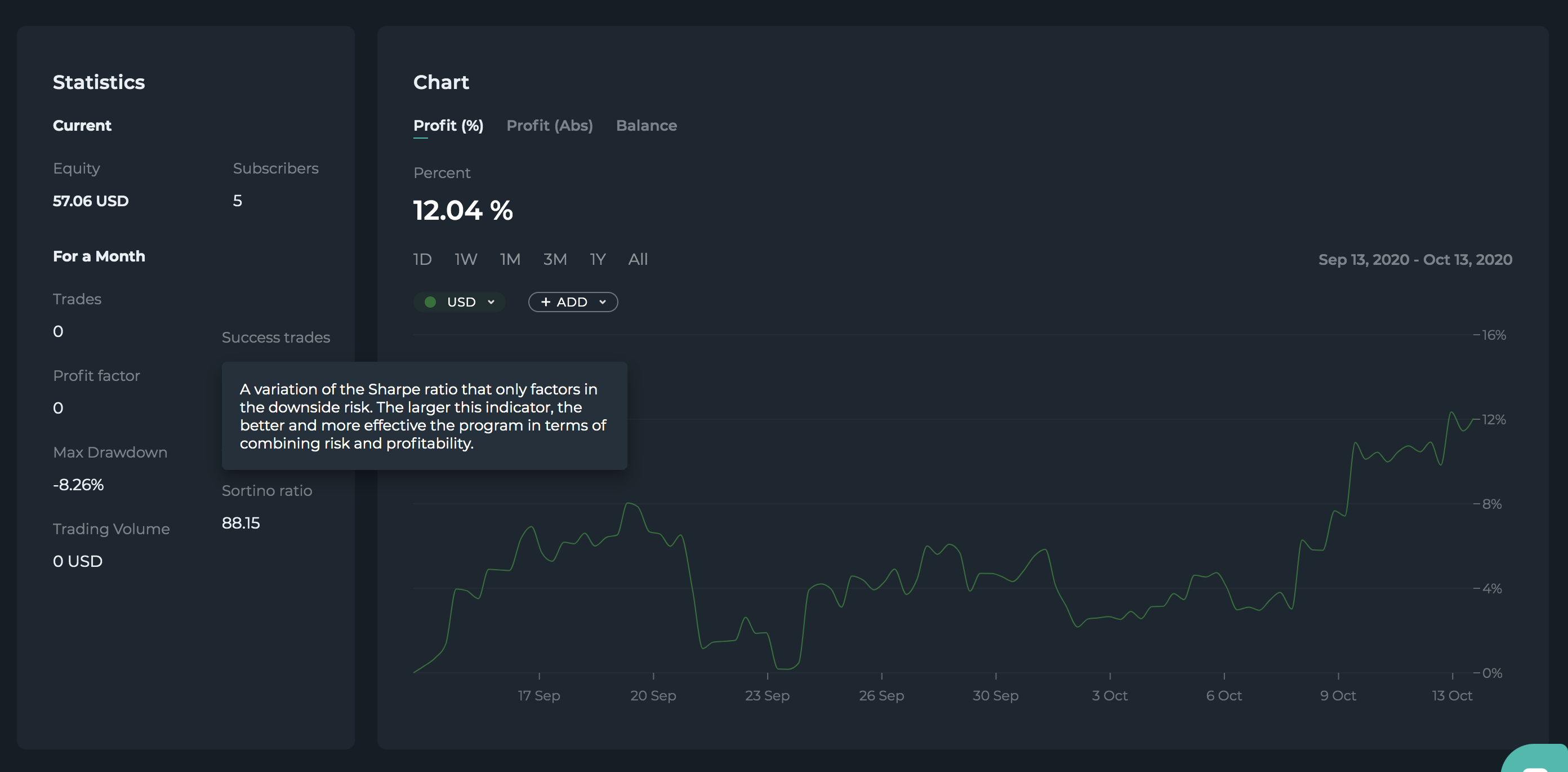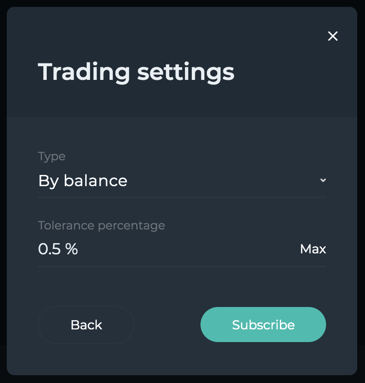 The tolerance percentage is the maximum possible deviation of the trade price from 0% to 20%. This means if you set it to 0% for the chosen subscription type, the trade must open at the exact same price as the provider’s trade. If a subscriber's price at the moment of the opening is worse than the original trade price for more than the set Tolerance percentage, the trade won’t be opened.