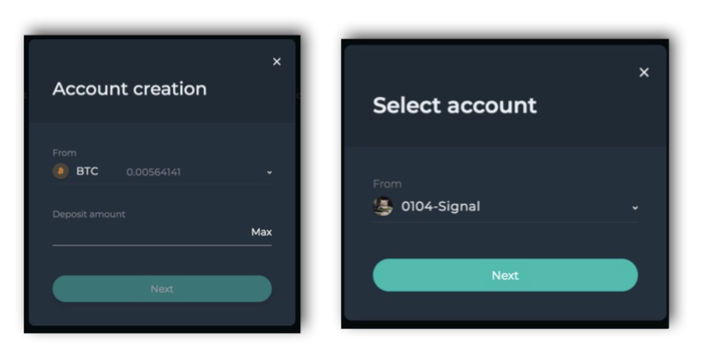 The first one will appear if you don't have a trading account yet. The system will help you to create one. Choose the wallet to invest in your trading account, type the amount, and press "Next".