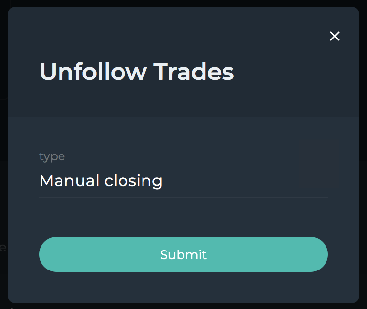 - Manual closing. You unsubscribe from the signal provider, but all the opened trades stay open. The Subscriber can close the open trades manually at any time. This means when the Provider closes their trades they will not be closed on the Subscribers trading account.